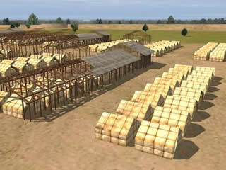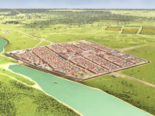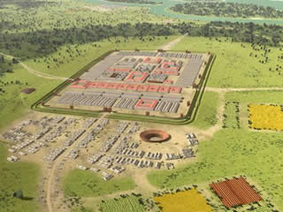 | Die 'Colonia Ulpia Traiana' in ihrer Blütezeit. Zu erkennen ist im Vordergrund der bereits teilweise verlandete Hafen. | Die Ziegelei südlich der 'Colonia'. |