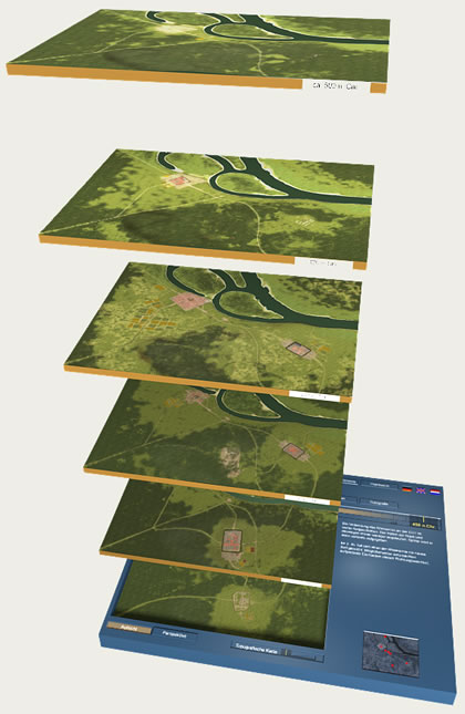 Ausgangspunkt ihrer Reise in die Vergangenheit ist ein computergeneriertes dreidimensionales Modell, das die Xantener Landschaft zur Römerzeit in sechs chronologisch ausgewählten Schichten in einem Ausschnitt von 8 x 8 km zeigt.