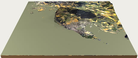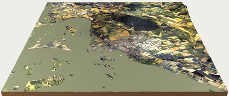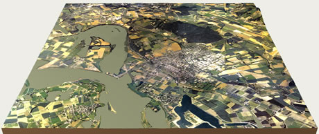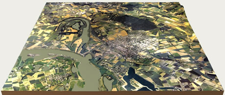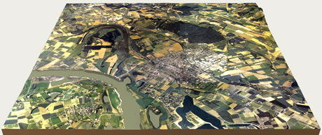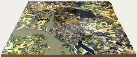 Diese Simulation entstand eher zufällig durch unsere Arbeiten an historischen Landschaftsmodellen. Dargestellt ist die Umgebung von Xanten, Kr. Wesel (D). Die heutige Stadt Xanten liegt auf dem linken Rheinufer (Bildmitte). Im Süden schließt sich der 74 m hohe Fürstenberg an (linker Bildrand). Am rechten unteren Bildrand erkennt man noch das Freizeitgelände mit der sogenannten Xantener Südsee. Besondere Beachtung verdient das Gelände des Archäologischen Parks Xanten, der ehemaligen Colonia Ulpia Traiana. Man erkennt an dem stetigen Steigen des Rheinwassers sehr leicht, warum die Römer seinerzeit ihre Stadt genau an dieser Stelle gegründet haben - selbst nach 8 m über dem heutigen mittleren Rheinpegel ist das Areal immer noch nicht überflutet. Auch die römische Infrastruktur war sorgfältig geplant. Die Straßen lagen in der Regel auf trockenen Terrassenkanten.