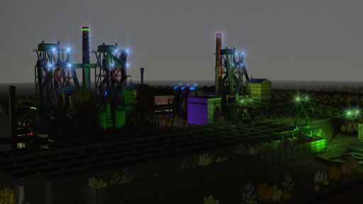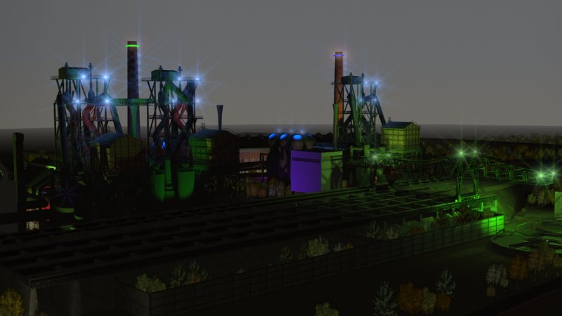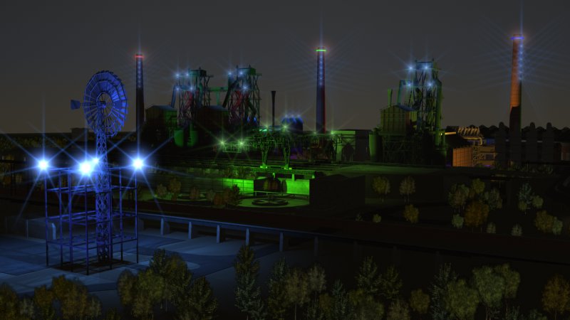 Genauer gesagt: es kam die Lichtinstallation. Wenn man sich mit dem Auto dem Autobahnkreuz Duisburg–Hamborn nähert, egal aus welcher Richtung, hat man bei Dunkelheit einen guten Blick auf den im farbigen Glanz erstrahlenden stillgelegten Hüttenbetrieb Meiderich. Die vom Künstler Jonathan Park kreierte Lichtinstallation wurde 1996 im Rahmen der IBA (Internationale Bauausstellung) installiert. So finden hier auch die drei Lichtfarben der Haupttätigkeitsfelder der IBA Verwendung. Blau für Wasser, Rot für den Städtebau und Grün für Landschaft und Renaturierung, je eine Farbe für die drei verbliebenen Schornsteinschäfte.
