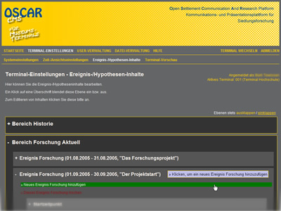 Das Terminal-CMS erfüllt die o. g. Ansprüche. Das System verfügt über eine hierarchische Benutzerverwaltung. Je Forschungs-Team, also je Terminal, können Administratoren- und Autoren-Konten erstellt werden.Terminal-Administratoren haben Zugriff auf alle Inhalte und Einstellungen. Terminal-Autoren haben lediglich Zugriff auf die Inhalte, sie können also Ereignisse und Medien mit Bildern und Texten erstellen, ändern oder löschen.