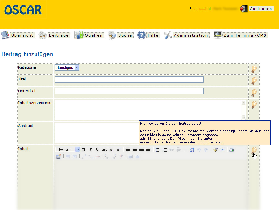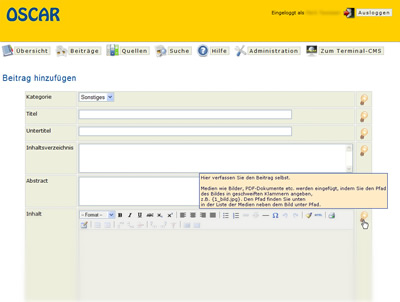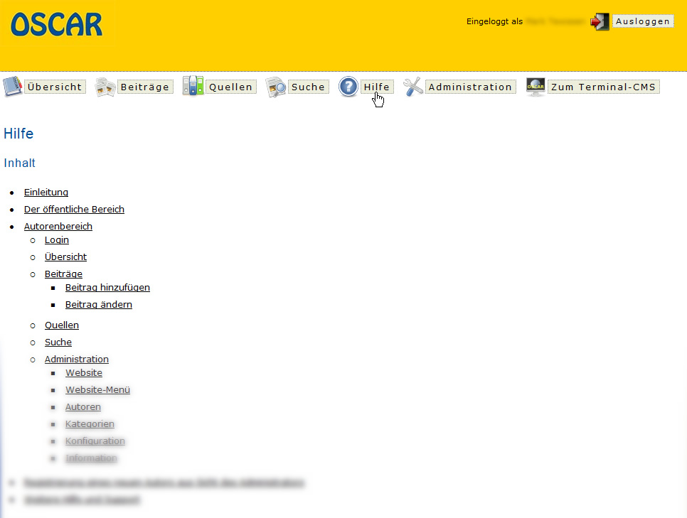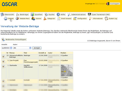 Der Web-OSCAR ist mit jedem internetfähigen Rechner erreichbar. Mit einer benutzerfreundlichen und übersichtlichen Obefläche können eingetragene Benutzer die Inhalte des OSCAR-Systems administrieren.