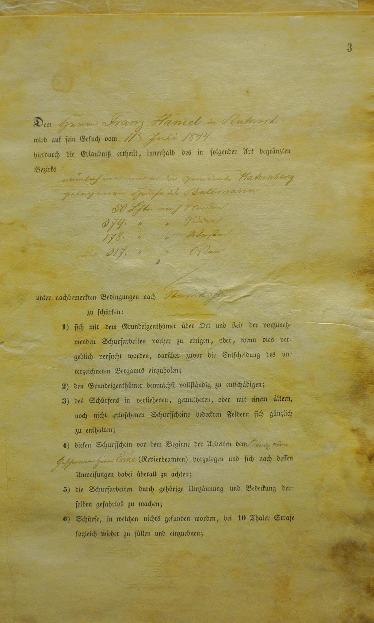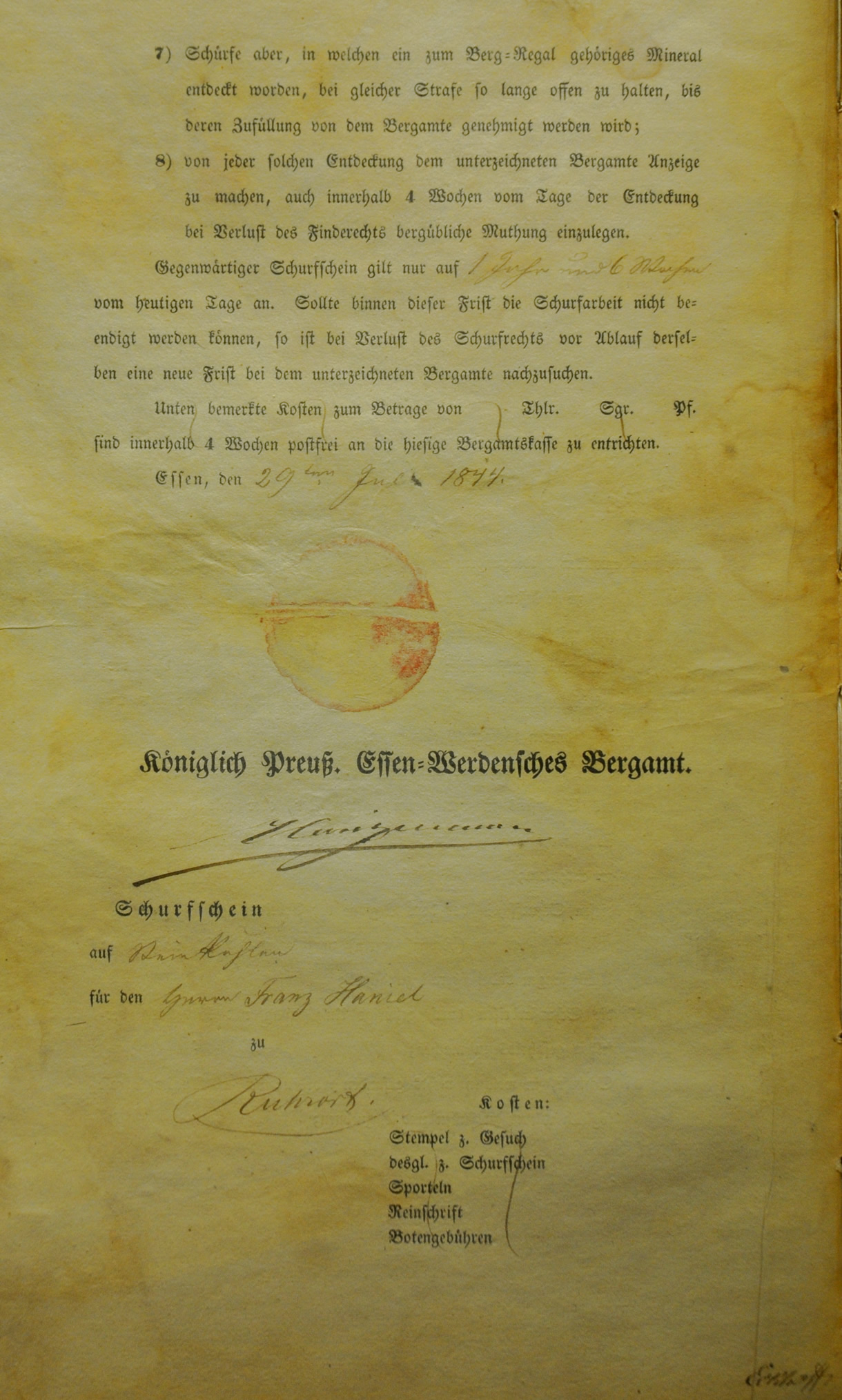 Aus nicht bekannten Gründen hat die Essener Gruppe nach den Bohrungen zwar 2 Mutungen erhoben, "Hermannus" und "Prinz von Preussen", die gesetzlichen Bestimmungen zur Verleihung aber nicht erfüllt, sondern immer vor Ablauf der Fristen neue Mutungen auf die Funde erhoben. Diese Vorgehensweise wurde teilweise auch benutzt, um Mitbewerber zu behindern. Um es vorwegzunehmen, diese beiden Mutungen werden in den Jahren 1845 und 1846 an die zweite Gruppe um den Kaufmann Franz Haniel verkauft, die die Mutungen dann auch weiterverfolgen wird.